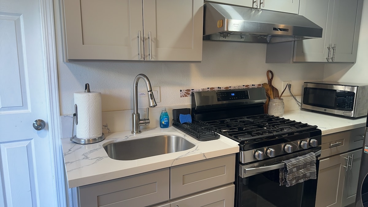 A completely new and renovated studio with your own easily accessible parking space, a private entrance, kitchen, and bathroom. It includes a queen size bed and a double twin bed. There is a large couch in front of a widescreen Roku TV with Netflix, an air conditioning/heating unit, a microwave, and laundry room. 我們也說中文