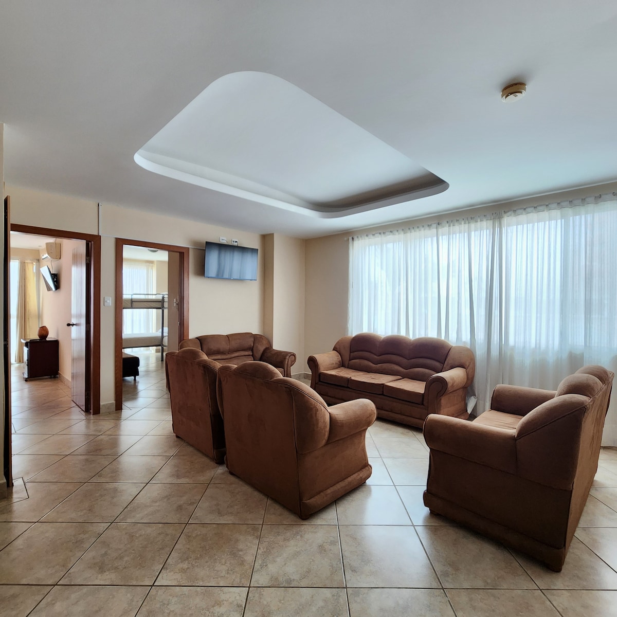 Quieres escapar de la rutina laboral y disfrutar con tu familia ? Este hospedaje es para ti, bonito , tranquilo y cómodo. Con servicios de restaurantes , farmacias , supermercados y gasolineras muy cerca, y la playa a solo 5 minutos caminando o 1 minuto en auto. Contamos con parqueadero y ascensor panorámico; el departamento tiene capacidad para 8 personas cómodamente. Ven y disfruta de una gran piscina, también hay una para niños y termina relajándote en el hidromasaje, sauna y turco. No 🐶🐱🚫