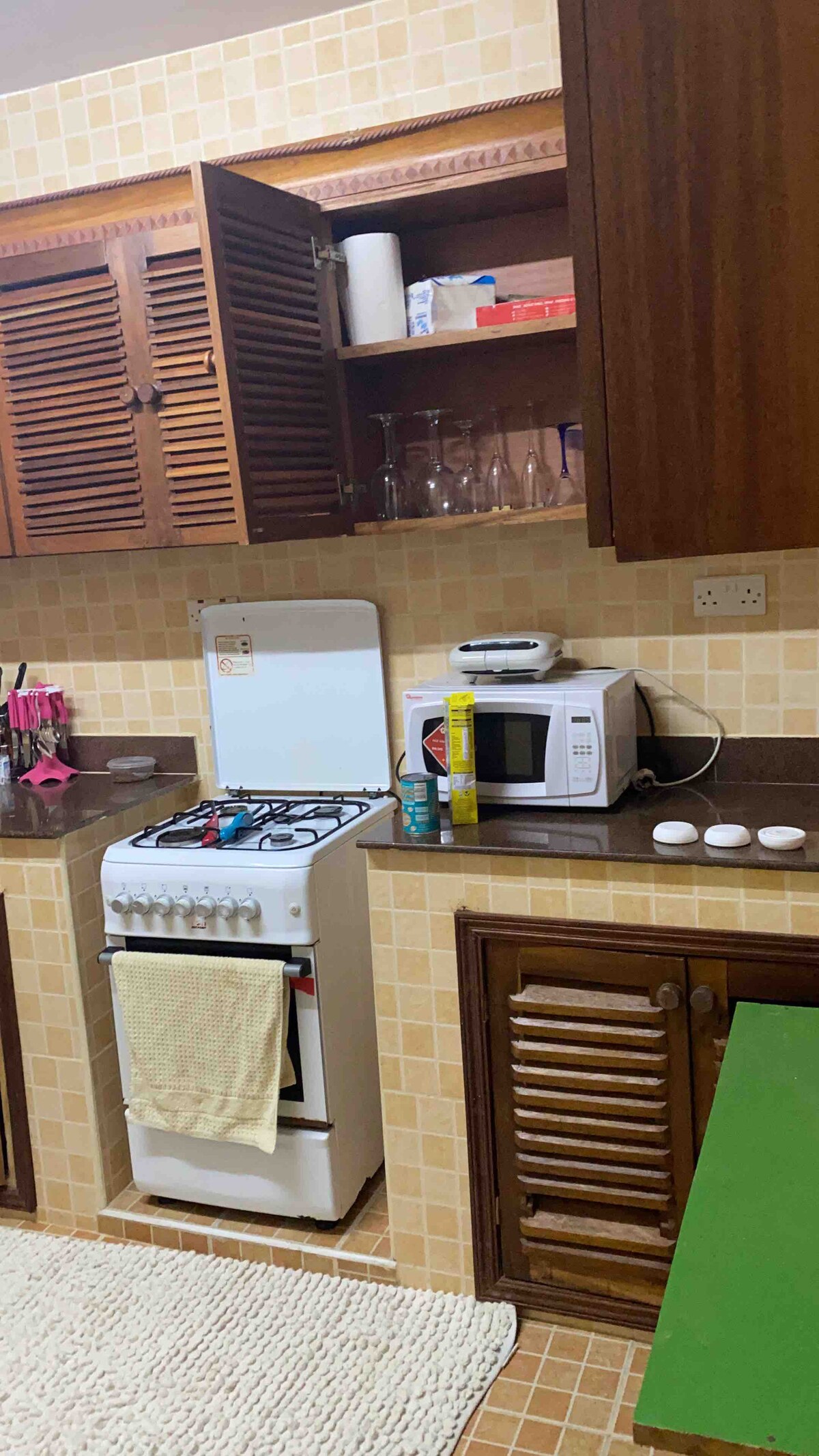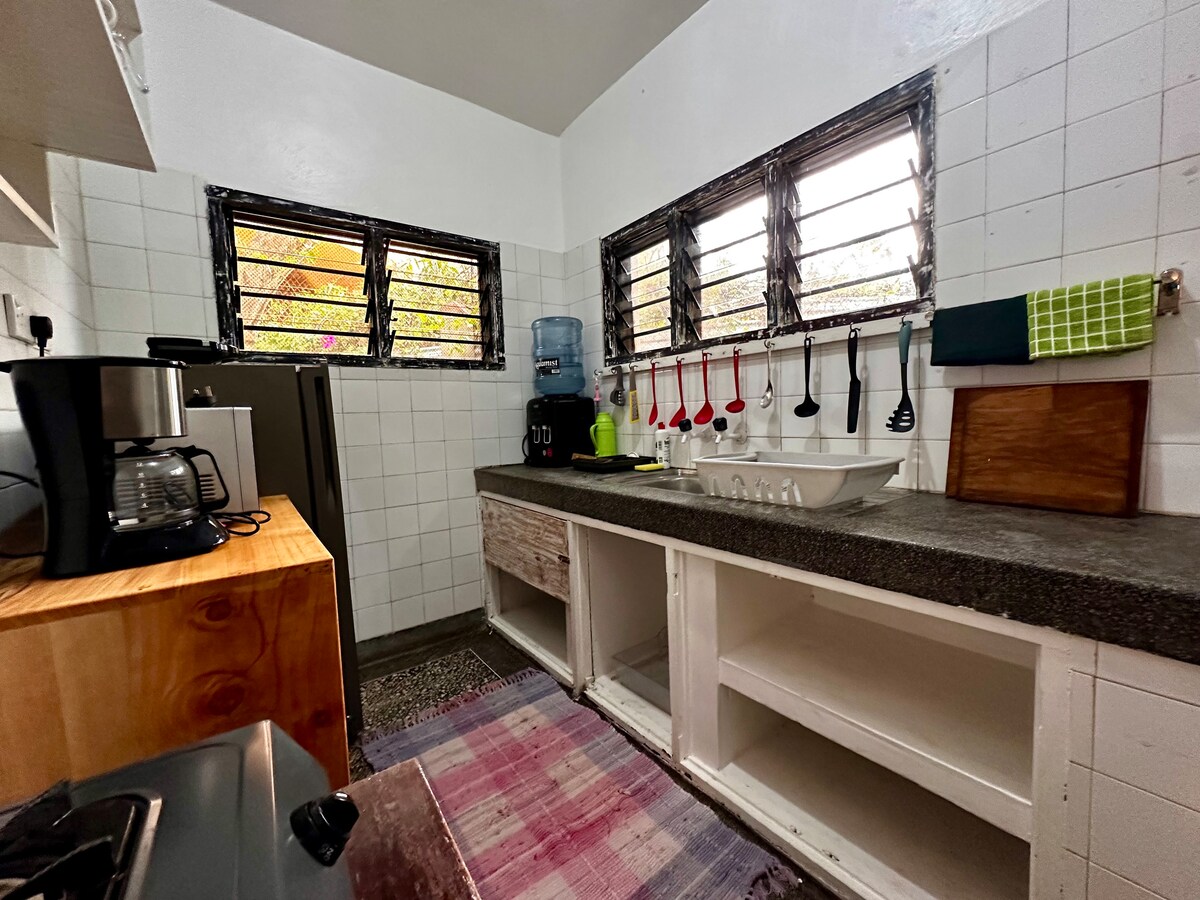 A simple, less is more interior decor 1bedroom house in Central Diani. Spacious, bright and perfect for short or long stays. A comfortable large sofa bed chair in the living room, flat screen smart TV, fast wifi and a dinning area that can be used as a study/work table. A fully equipped kitchen, queen size bed in the bedroom, a clean bathroom stocked with towels and toiletries. High roof with ceiling fans, extra standing fans, dehumidifier & large louvre glass windows for air circulation.