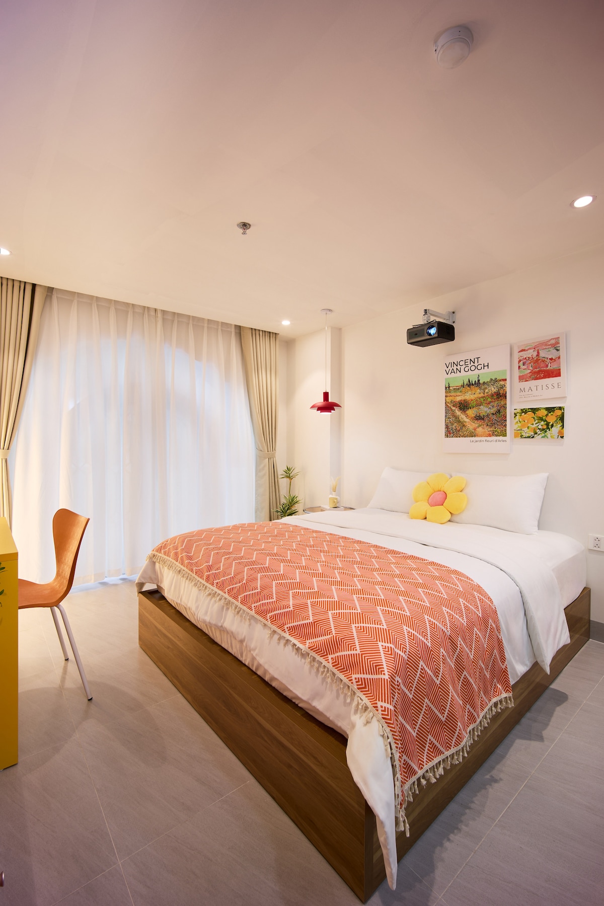 Căn phòng nằm ở tầng trên, mang lại nhiều không khí trong lành và độ sáng. Ý tưởng về thiết kế tối giản xác định phong cách hiện đại cho căn phòng. Ngồi bên cửa sổ với một cuốn sách và để gió thổi vào phòng của bạn.