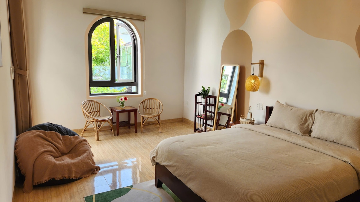 Chào mừng bạn đến với phòng rộng rãi và yên bình nhất tại Hoi An Ikigai Home. Được thiết kế dựa trên triết lý Ikigai, phòng suite này mang đến một không gian yên tĩnh và tối giản, tràn ngập ánh sáng tự nhiên dịu nhẹ và tông màu đèn lồng ấm áp. Phòng hoàn hảo để thư giãn sau một ngày khám phá Hội An. Nằm ở một góc yên tĩnh của ngôi nhà, chỗ ở mang lại sự thoải mái và riêng tư hơn trong khi vẫn chỉ cách Phố cổ 7 phút và cách bãi biển An Bàng 10 phút.