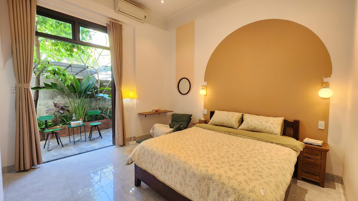 Welcome to a cozy ground-floor room at Hoi An Ikigai Home, perfect for guests who enjoy quiet spaces and nature. The room features a comfortable queen bed and direct access to a small private garden, offering fresh air, greenery, and soft morning light. Inspired by the Ikigai philosophy, the design is simple, warm, and peaceful with natural textures and lantern lighting. It’s a calm place to relax, sip coffee in the garden, and unwind after exploring Hoi An.
