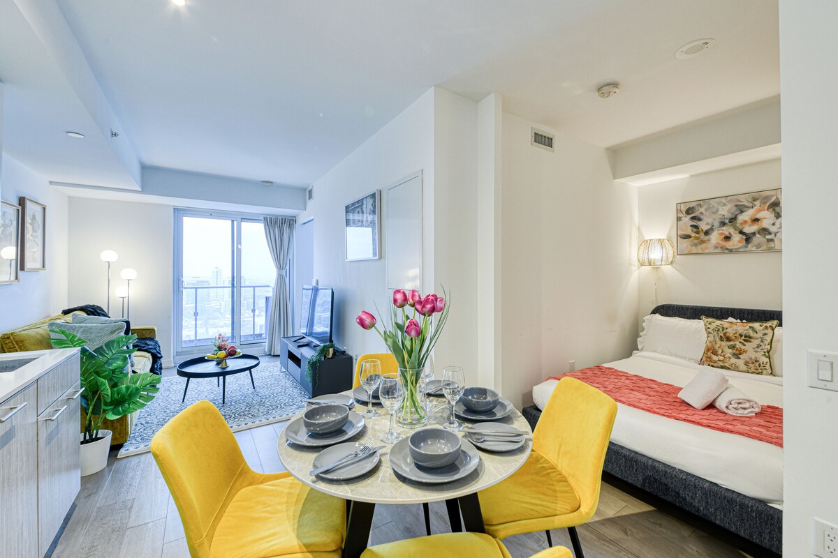 Marvel at the glorious Toronto urban vibes from your room with floor to ceiling panoramic windows. This 1 bedroom condo is professionally designed with modern finishes. You will absolutely love the space we have prepared for you. Relax, unwin,d and enjoy the city views on the private balcony with outdoor furniture. Professionally cleaned after each guest checkout. 100% private and unshared, entire modern condominium unit. Safe, secure, and easy self-check-in procedures with 24/7 security.