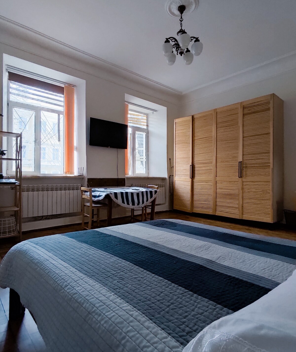 Квартира в трьох кварталах від Соборної площі. Знаходиться в історичній частині міста. Дві окремі кімнати: спальня з ліжком і мальовничим балконом на фасад, вітальня з розкладним диваном і робочим місцем. Мінімалістична кухня з усім необхідним та затишний об'єднаний санвузол. У квартирі проведено оптоволоконний інтернет, а також є проектор з можливістю підключення до YouTube або потокових сервісів. На вулиці є кав'ярні та кафе. В пішій доступності є Новий Ринок і Книжний ринок.
