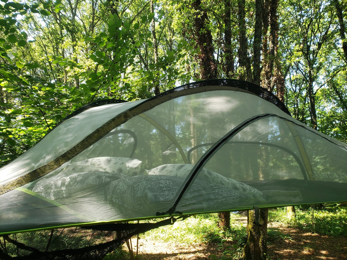 Bạn có biết rằng có thể qua đêm giữa thiên nhiên, trong không khí, như một sự bay lên trong lều treo không? Giữa cây sồi, hạt dẻ và cây tro, lều treo cung cấp cho bạn một khung cảnh bình dị càng gần với thiên nhiên hoang sơ. Tiếng hót của những con chim, tiếng xào xạc của những chiếc lá.....nằm trên con đường xe đạp nối liền ba bãi biển của hồ.