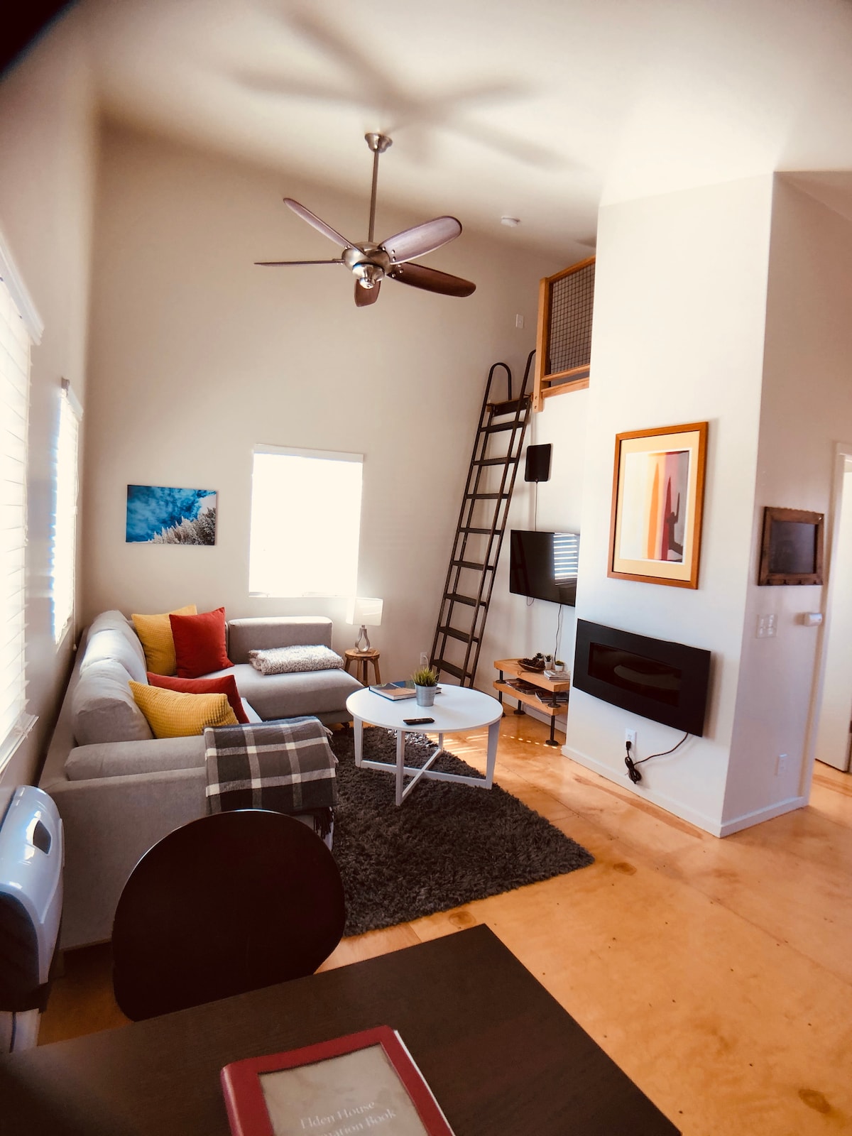 Sunny, modern 1 bedroom with loft (QN. floor mattress in loft) accommodating TWO guests in the NOHO district of Flagstaff. Soaring 14' ceiling make the modest space feel much larger. Plenty of space to work, or relax. Great kitchen, and luxury bath. Walk downtown, or if staying in, our place offers SmartTV and WIFI. Buffalo Park and extensive trail system 4 blocks away! Snowbowl ski resort 30 minutes, Grand Canyon 75 minutes, Sedona 40 min. from our door. Perfect base for your N. AZ. Adventure!