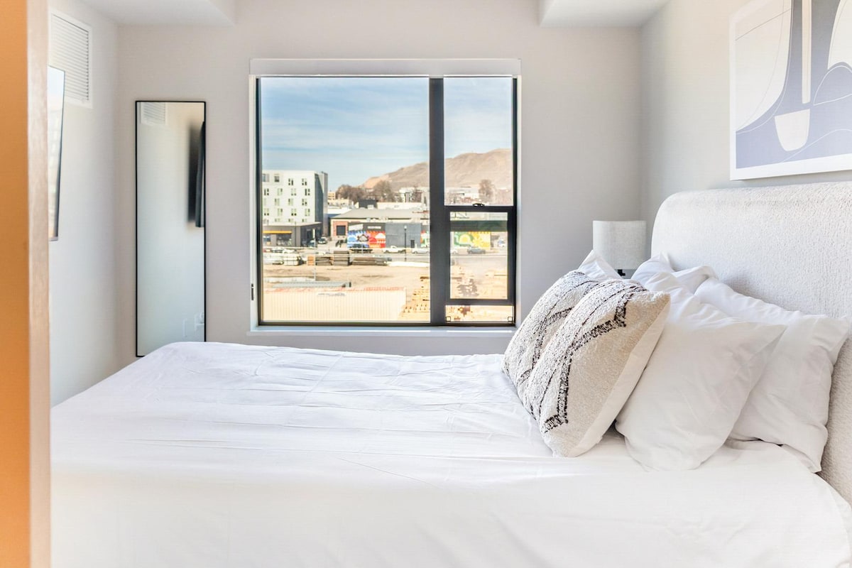 Tận hưởng một chốn nghỉ dưỡng sáng sủa ở Salt Lake City, cách các cửa hàng, quán ăn và điểm tham quan chỉ vài bước chân, lý tưởng cho công việc hoặc vui chơi. - 4 người | 1 phòng ngủ | 1 giường cỡ King + nệm hơi | 1 phòng tắm - Sân hiên riêng & chỗ đỗ xe miễn phí trên đường phố; Có sẵn bộ sạc cho xe điện - Phòng tập thể dục chung trong tòa nhà; có thang máy - TV thông minh 65", Wi‑Fi và ethernet; không gian làm việc riêng - Bếp đầy đủ tiện nghi, máy giặt và máy sấy; bộ đồ giường ấm cúng - Vị trí tuyệt vời, các quán ăn gần đó; chủ nhà thân thiện và phản hồi nhanh