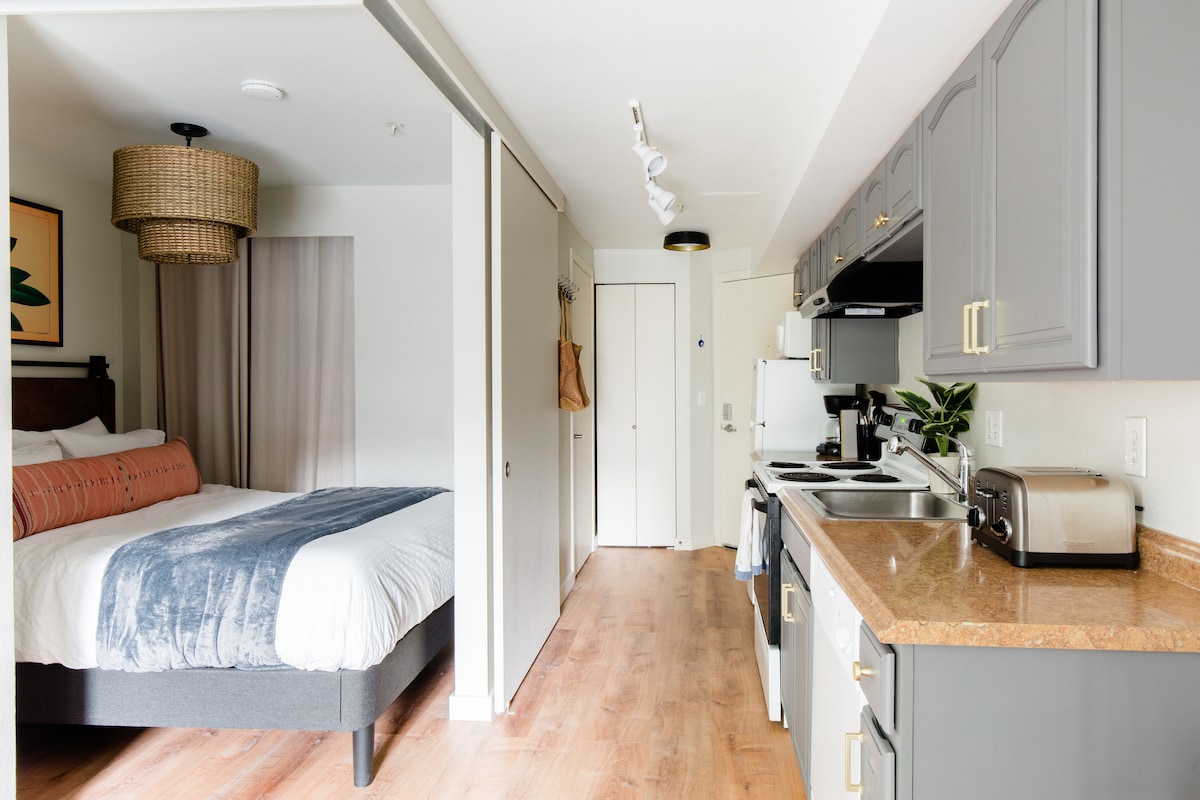 Căn hộ 1 phòng ngủ/phòng ngủ riêng khổng lồ từ cầu thang bên nhà. 950 ft vuông mới được sửa sang lại trên con phố mang tính bước ngoặt lịch sử. Đỉnh đồi… 2 dãy nhà đi BỘ đến hơn40 nhà hàng, quán bar, cửa hàng bán lẻ, cửa hàng tạp hóa. Được trang trí với nghệ thuật được tuyển chọn, nhà bếp của đầu bếp, phòng làm việc với giường ban ngày, giặt ủi, ban công tầm nhìn rộng rãi. Trần vòm/phòng đầy nắng. Nệm Casper mới, ga trải giường Brooklinen sang trọng. Wifi nhanh, TV Samsung/loa soundbar Bose với truyền hình cáp/phát trực tuyến. Thư viện du lịch Tây Bắc. AC! 2 xe buýt 2 dãy nhà. Bãi đỗ xe miễn phí