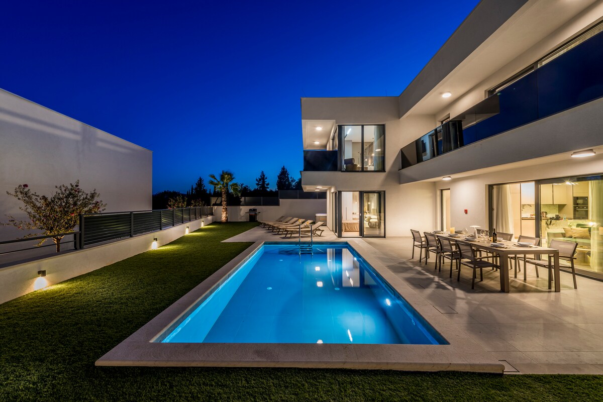 This luxurious, cascading villa is nestled into a verdant landscape, with an oceanfront view overlooking the cerulean sea. The ultra modern interior is detailed with sophisticated touches, such as polished wooden décor and sumptuous sapphire sofas. Your choice of beautiful beaches along the Makarska coast await, with the closest one being just a few short, scenic steps away from your backyard. Each bedroom boasts mesmerizing vistas of either the garden greenery or sparkling surf. A glass railing on the balcony ensures an unobstructed field of vision. Dive into the turquoise-tiled all-season pool for an instant cool down, or take a seat on one of the built-in hydromassage loungers, taking your relaxation to the next level. No matter what season you visit, this modern abode has your comfort taken care of—air conditioning in the summer and a floor heating system in the winter. A fully-equipped kitchen offers all the essentials needed to whip up an inky risotto with a fresh octopus salad. Tucked around the side of the house is an alfresco dining option. Ideal for a family vacation, the kids will love the stretches of sugary sand while adults can appreciate the beauty of watching the sun setting over the horizon with a chilled glass of champagne in hand. Why not see as much of Croatia as possible while you’re there? Villa Blue Moon’s location is ideal for day trips to nearby cities such as Dubrovnik, Mostar, and Makarska. The islands of Hvar, Korcula and Peljesac peninsula are also easily accessible. Copyright © Luxury Retreats. All rights reserved. BEDROOM & BATHROOM • Bedroom 1 - Primary: King size bed, Ensuite bathroom with stand-alone bathtub, Safe • Bedroom 2: King size bed, Ensuite bathroom with stand-alone rain shower, Access to shared balcony, View of Adriatic Sea • Bedroom 3: King size bed, Ensuite bathroom with stand-alone rain shower, Access to shared balcony, View of Adriatic Sea • Bedroom 4: 2 Twin size beds (can be converted to a king), Ensuite bathroom with shower/bathtub combo, View of Adriatic Sea STAFF & SERVICES Extra cost (advance notice may be required): • Additional housekeeping • Activities and excursions • More under “Add-on services” below