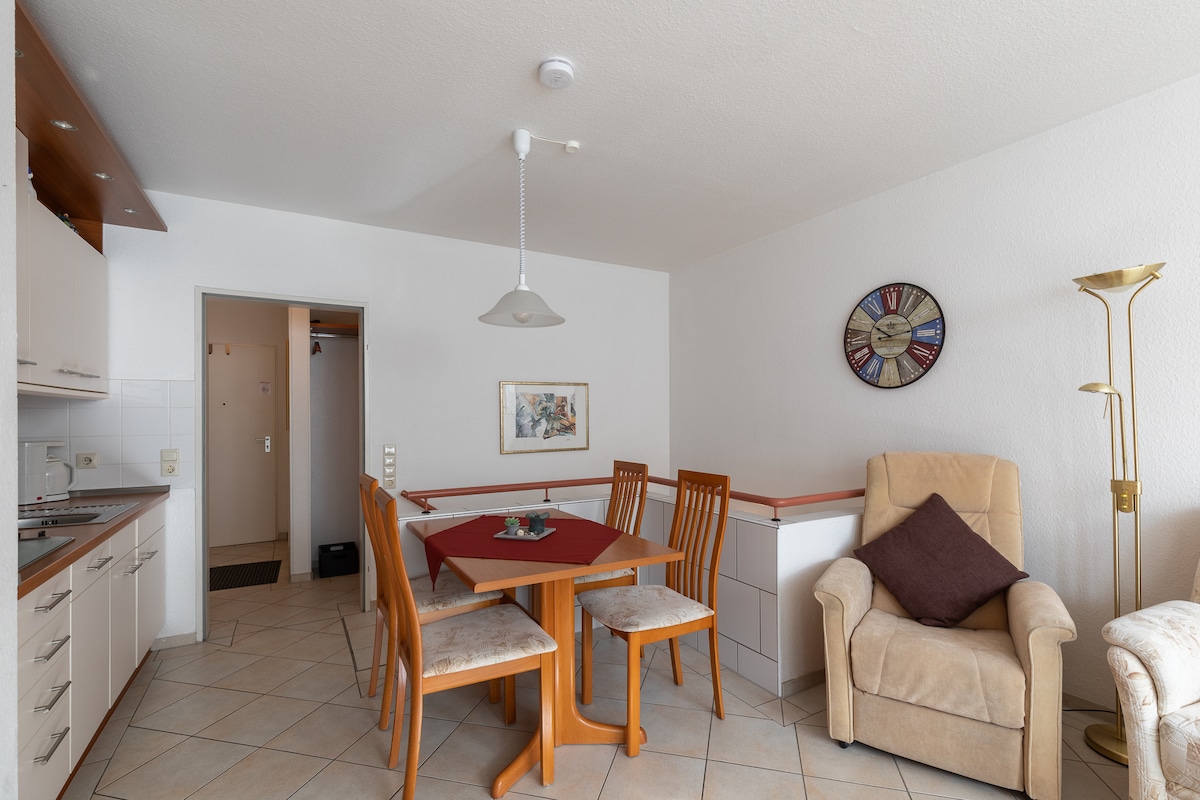 Căn hộ sáng sủa gần bãi biển này lý tưởng cho 2 người. Nó có một phòng khách/phòng ngủ với nhà bếp mở (trang bị đầy đủ), phòng tắm vòi sen và ban công hướng về phía nam. Nhà có hồ bơi, phòng xông hơi khô, phòng tập thể dục, bóng bàn và máy giặt. Đã bao gồm trong giá là chỗ đỗ xe ô tô và 2 chỗ đỗ xe đạp. Vui lòng mang theo khăn trải giường và khăn tắm riêng của bạn. Bạn cũng có thể đặt phòng với một khoản phí nhỏ.