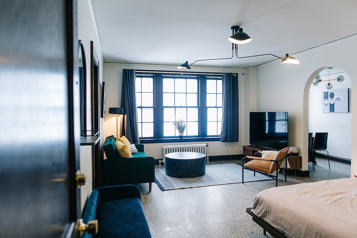 Located within The Wilson, this spacious second-floor studio offers a peaceful stay on the quiet side of the building. Historic charm meets modern comfort with a beautifully renovated kitchen featuring a dishwasher and an updated bathroom. Guests enjoy access to the shared rooftop deck overlooking nearby restaurants and nightlife. Hosted by a local husband-and-wife team passionate about thoughtfully curated spaces. Second-floor walk-up and paid parking nearby.