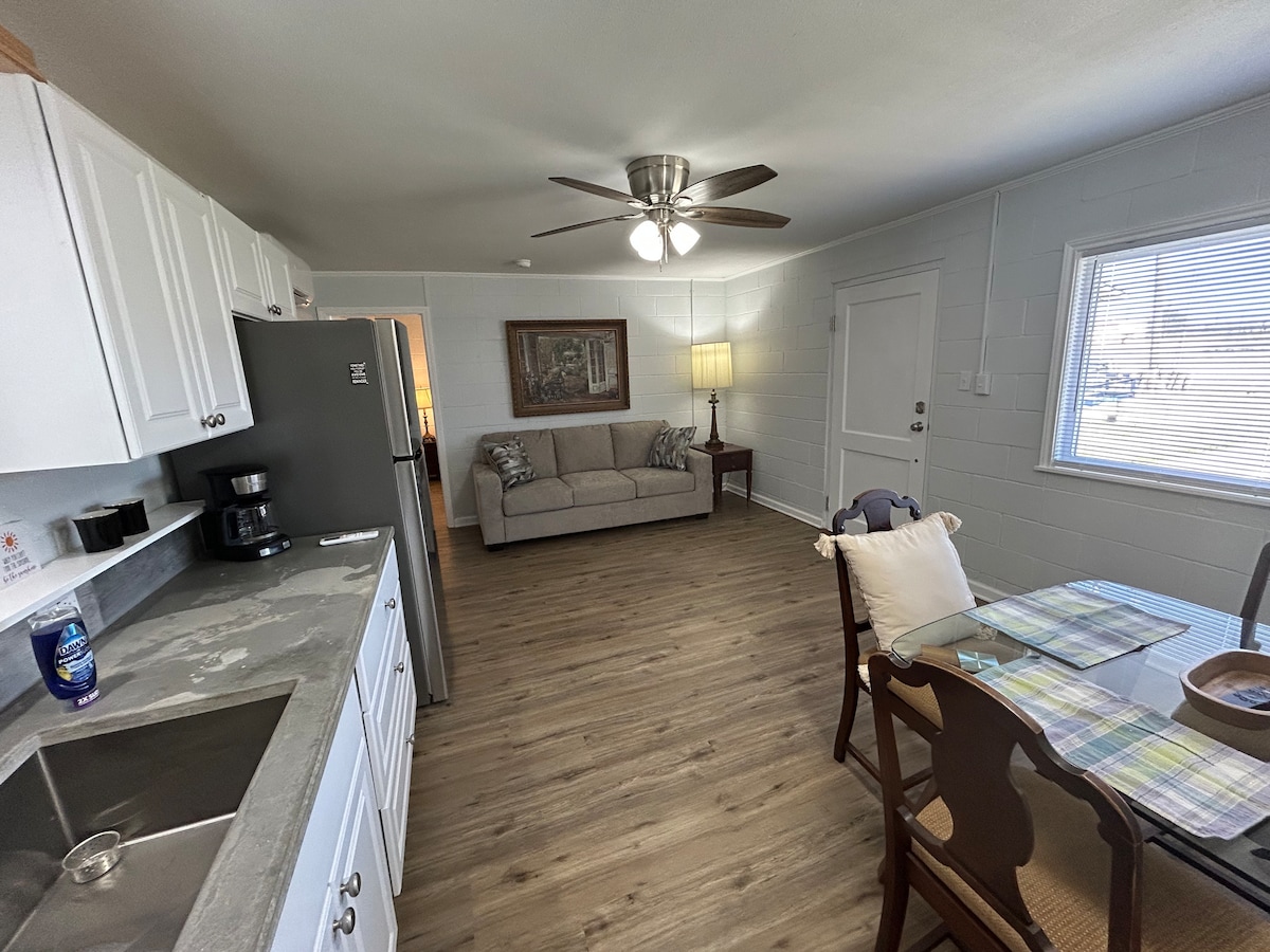 Kick back and relax in this calm, stylish space. This house has 2 bedrooms and 2 full bathrooms upstairs in the main part of the house. The master bedroom has a queen size bed. The secondary bedroom has a full over full bunk bed. Additional bunk room downstairs that can sleep 2 . There is a half bath located downstairs as well . Fish off the dock , play volleyball while you grill out! Corn hole game included! Gorgeous 180 degree water view.