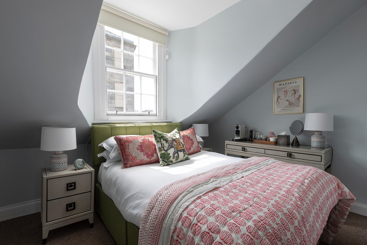Sáng sủa và rộng rãi, Phòng Suite Gia đình Deluxe nhìn ra những con phố xanh của quận Mayfield của Edinburgh. Với một giường đôi và hai giường đơn, đây là nơi lý tưởng cho các gia đình hoặc nhóm tìm kiếm sự thoải mái và cá tính. Cửa sổ lồi cao làm căn phòng tràn ngập ánh sáng, làm nổi bật các chi tiết thời kỳ thanh lịch và điểm nhấn hoa cỏ ấm áp. Một sự pha trộn hoàn hảo giữa sự quyến rũ của Scotland và sự thoải mái hiện đại cho một kỳ lưu trú thư giãn trong thành phố.