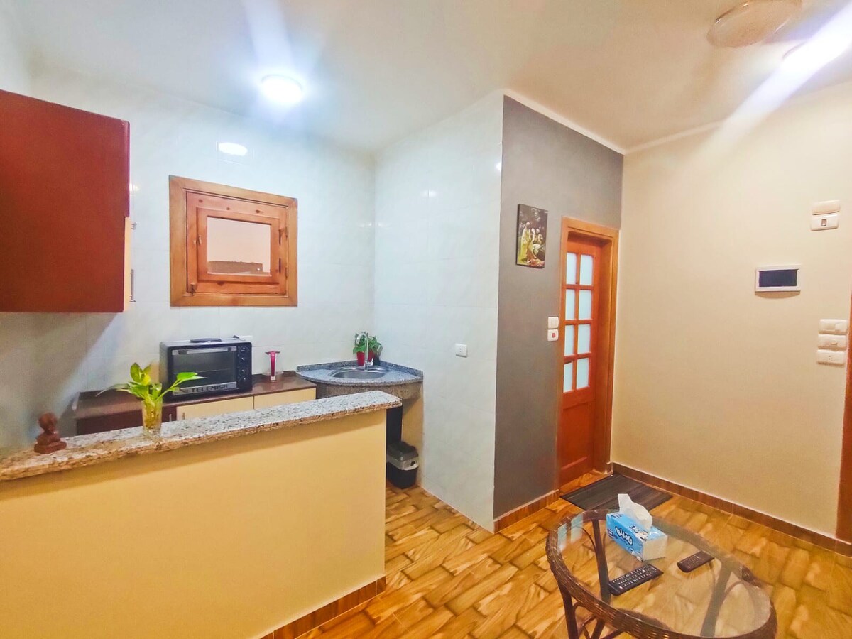 This is a cozy still very spacios studio that looks like a pyramid/tree house... located in a very nice neighbourhood with all facilities available around. It's a 2 mins walk from a services mall (supermarket, laundry, cafes, restaurants, pharmacy). 15 mins drive to the Pyramids and the new Egyptian museum. 25 mins drive to downtown.