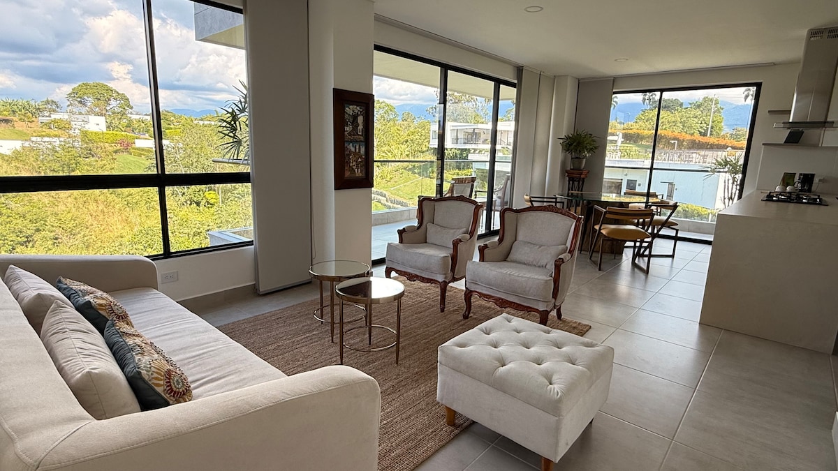 Sensacional y elegante apartasol rodeado de naturaleza; totalmente equipado para una placentera estancia. Podrás disfrutar de un lugar impecable, nuevo con un diseño fresco y acogedor; vigilancia las 24 horas. A 5 minutos del Aeropuerto y 20 minutos del Parque del Café. Comodidades tipo resort: 3 piscinas, tobogán, juegos infantiles, jacuzzi, BBQ, lavadora. Situado estratégicamente para conocer todo el eje cafetero y ciudades como (Pereira 1h30m y Cali 2h30m).