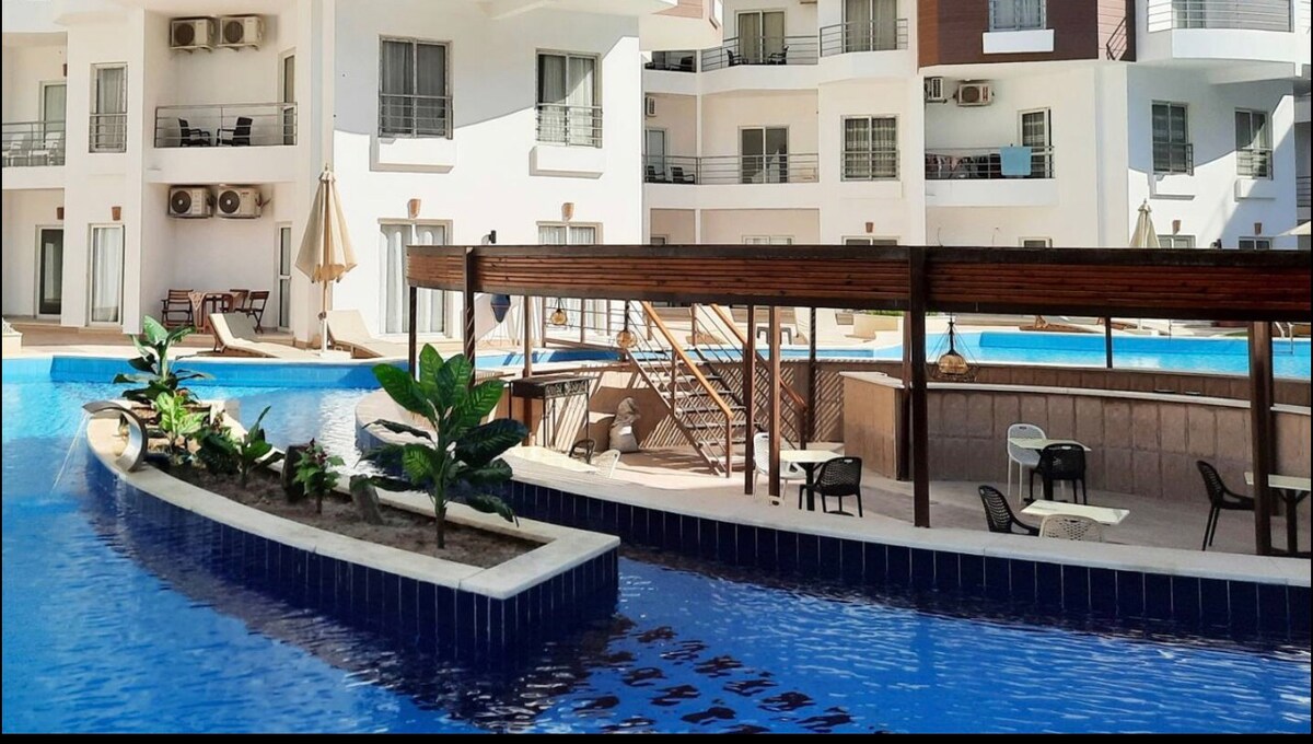Have fun with the whole family at this stylish place.adress el ahya Selena bay resort hurgada city the apartment have two bed room one bathroom and a kitchen large salon with big treas with sea view and pool view the apartment has three air conditioners one washer machine one oven one cooker and one heater in the bathroom.one bed room has a big bed the other room has two beds the salon has a large sofa television and dining table. The resort has 4 pools and beautiful beach for the resort