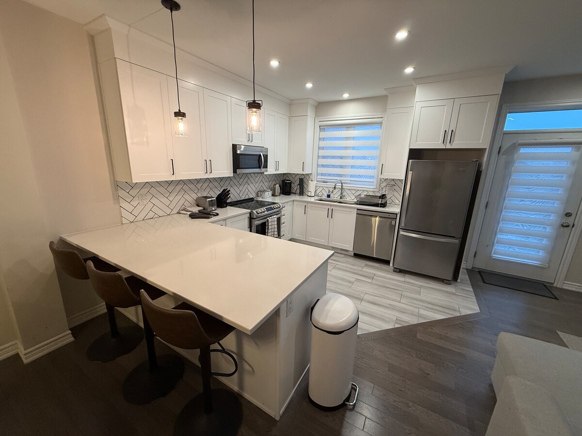Less than 14 minutes away from Downtown Ottawa, this newly built 2021 modern and open concept townhome comfortably accommodates large groups. It is close to many amenities such as Movati, Landmark Cinemas, Walmart, Canadian Tire, Moxies, Lonestar, and much more. This home includes 8 beds, 4 bedrooms, 3.5 bathrooms, a large breakfast bar area, a private office space, 10ft ceilings across the main floor, a warm and modern living and dinning room area, new washer and dryer, and much more.