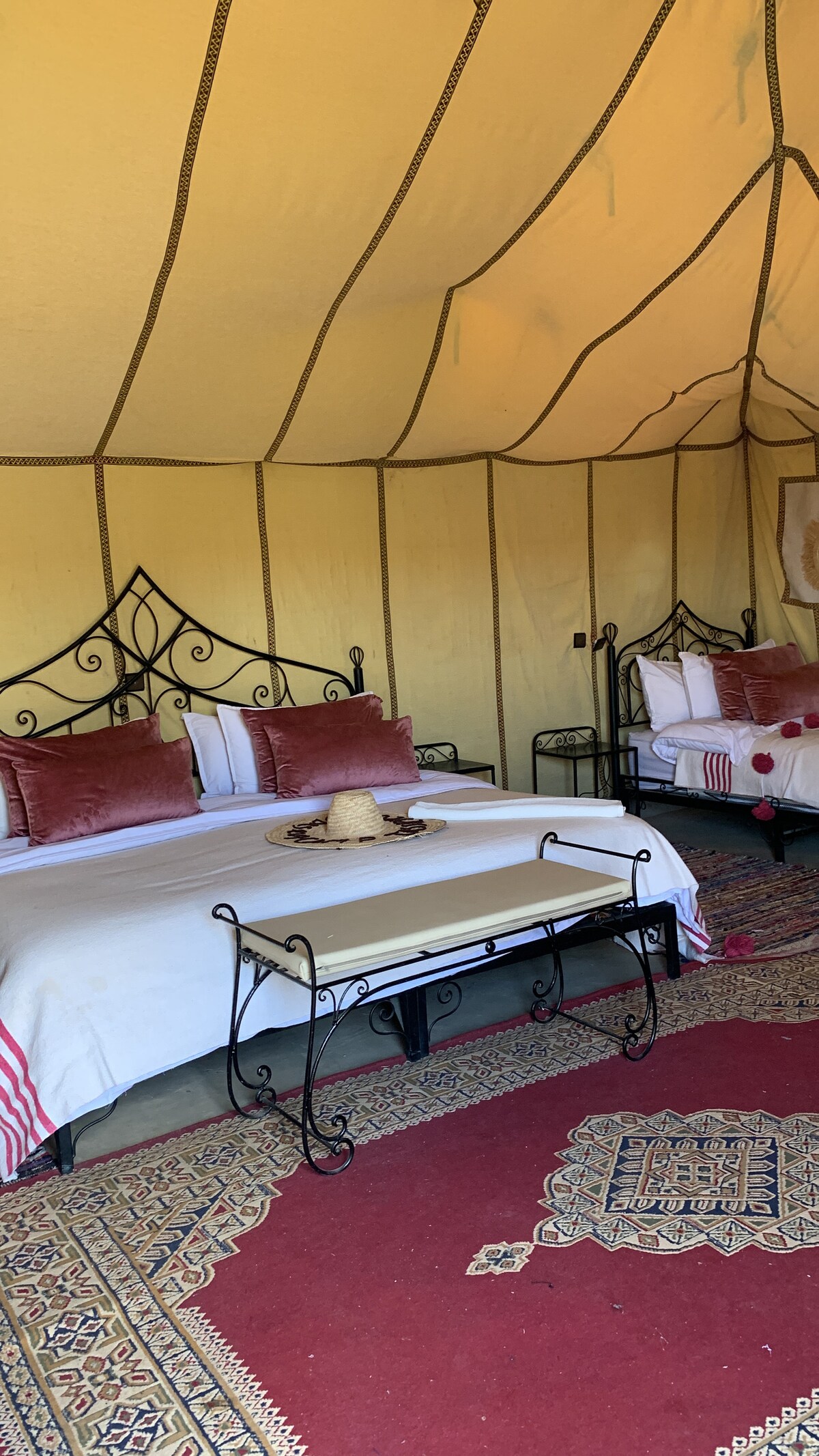 Lều sang trọng của tôi ở Merzouga là một ốc đảo phi thường nằm giữa những cồn cát đầy mê hoặc của sa mạc Sahara. Được bao quanh bởi những cảnh quan ngoạn mục, chỗ ở độc đáo này mang đến tầm nhìn tuyệt vời ra bãi cát vàng trải dài đến tận tầm mắt. Bên trong, lều rộng rãi của tôi được trang trí tinh tế của Ma-rốc và được trang bị tất cả các tiện nghi hiện đại - ga trải giường, phòng tắm riêng với nước nóng và điều hòa không khí cho những đêm sa mạc ấm áp.