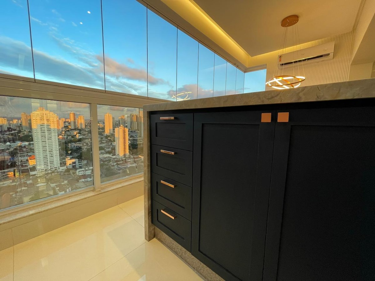Alto padrão, 3 Suites mais Lavabo Amplo 110 m2 todo Mobiliado, tudo que você precisa inclusive enxoval de camas, toalhas, . , Jardim Goiás, Ao Lado do Parque Flamboyant e 200 metros do Shopping Flamboyant, 2 Garagens, Lazer, Sauna , Academia , Salão festas, Sala Reunião, Churrasqueira, Quadra Poliesportiva, piscina 500 metros do Acesso BR 153. Acomoda de forma confortável. 2 vagas garagem fácil de estacionar., mercados, padaria, farmácia e uma praça muito agradável. Reserva Minima de 2 dias