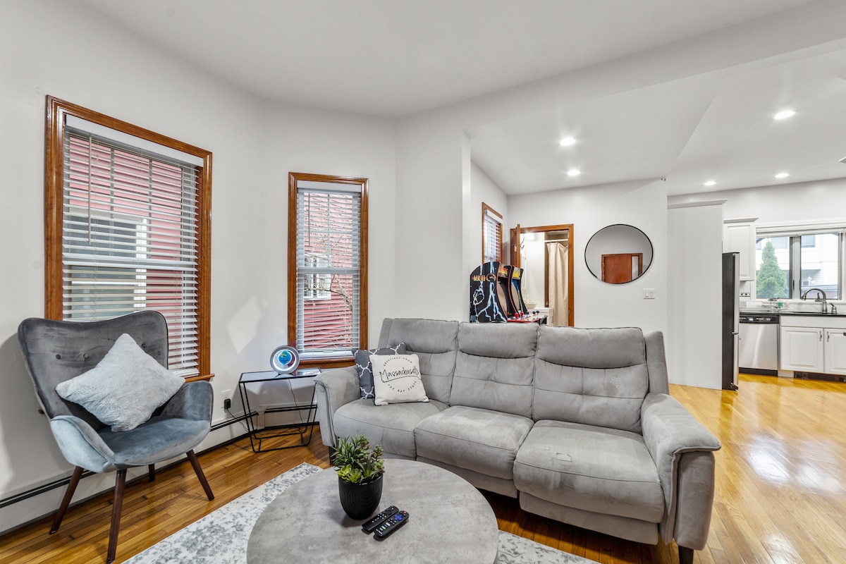 Newly renovated luxury 2 bed/1 bath apartment in Everett next to Boston. One car parking spot on property. This is a FIRST FLOOR UNIT of a Multi Family home. Amenities: -Fully equipped kitchen (Coffee, Snacks & Water) -Hi-Speed Wifi -55inch 4k TV w/ 1000+ streaming live tv channels/movies/sports & Netflix/Hulu included w/ stay. - Two full sized arcade machines loaded with Mortal Kombat,Rampage,& more -Bathroom (Complimentary hygiene kit).