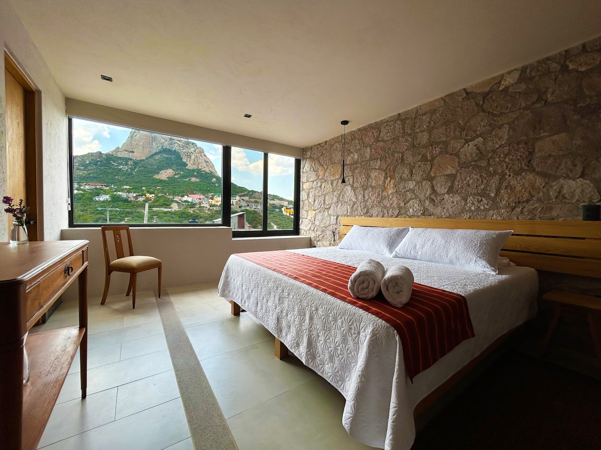 Una cómoda y segura habitación en el Hotel La Roca, en Bernal, a tan solo unos minutos del centro del pueblo y de la imponente peña.