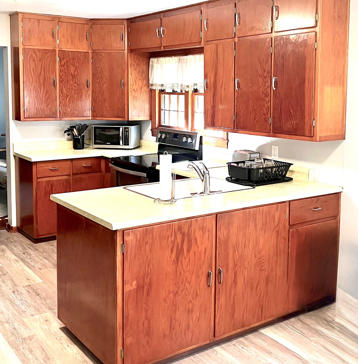 Nhà theo phong cách trang trại rộng 1.200 ft vuông với 2 phòng ngủ, 1 phòng tắm. Phòng ngủ chính có 1 giường cỡ queen, phòng ngủ thứ 2 có giường tầng đôi và giường gấp đôi cỡ twin, cho phép ở tổng cộng 5 khách. Các thiết bị có sẵn để sử dụng là máy giặt/máy sấy có thể xếp chồng lên nhau, tủ lạnh, bếp nấu, lò vi sóng và máy rửa chén. Có sẵn bếp nướng dùng khí propan mới hơn để sử dụng. *Giường tầng sẽ gây khó khăn cho người cao tuổi do giường dưới nằm thấp. Giường tầng thực sự được thiết kế cho trẻ nhỏ hơn.