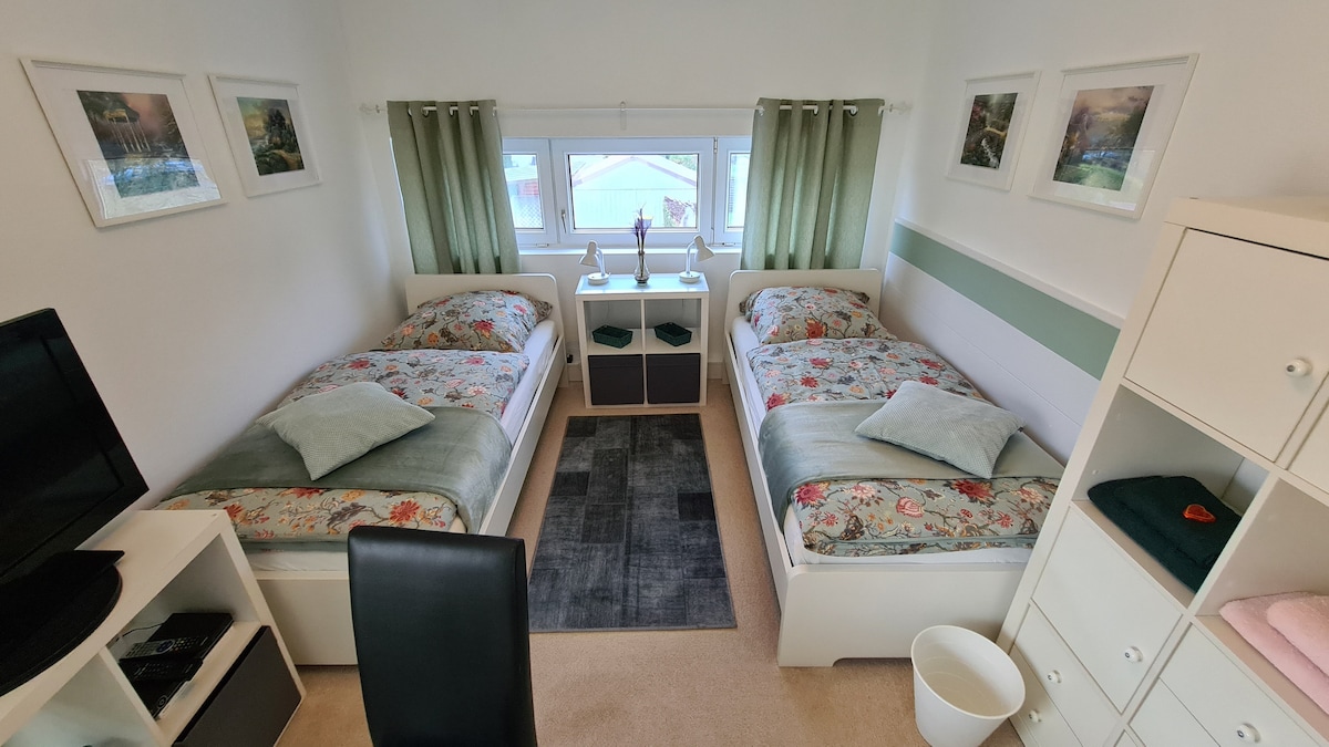 Căn hộ hai tầng sáng sủa với lối đi riêng. Bạn / bạn sống trong căn hộ 1,5 phòng của riêng mình ( 35 m2) với lối vào và cầu thang riêng trên tầng 1 và 2 của ngôi nhà tách biệt của chúng tôi. Nhà bếp có mọi thứ bạn cần. TIỀN THƯỞNG : Trong tủ lạnh một bữa sáng nhỏ cho buổi sáng đầu tiên sau khi đến. Ghế mát-xa để thư giãn. Bạn có thể đến khu vực phía trên thông qua một cầu thang xoắn ốc nhỏ trong căn hộ. Ở phòng ngủ ở tầng trên với giường đôi ấm cúng cũng như phòng tắm vòi sen. 3. pers. theo yêu cầu !