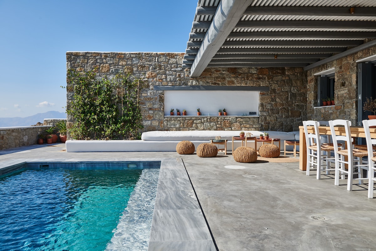 Trốn đến một trong hai biệt thự sang trọng hoàn toàn mới của chúng tôi ở Mykonos với tầm nhìn hoàng hôn ngoạn mục ra Biển Aegean và các hòn đảo lân cận. Hoàn hảo cho sự riêng tư và yên tĩnh, biệt thự 3 phòng ngủ, 2,5 phòng tắm này có khu vực sinh hoạt rộng rãi, hồ bơi ngoài trời riêng, sân hiên lớn với pergolas, nhà bếp đầy đủ tiện nghi, điều hòa không khí, bãi đỗ xe 2 xe, khu vực ăn uống trong nhà và ngoài trời và tầm nhìn tuyệt đẹp từ mọi cửa sổ. Nằm cách Thị trấn Mykonos chỉ 4 km. Trải nghiệm nơi nghỉ dưỡng sang trọng tuyệt đỉnh.
