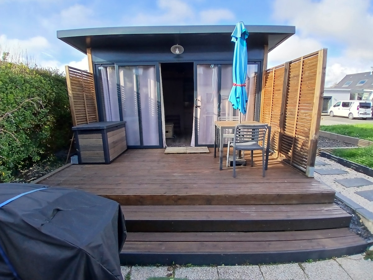 CABANE, COTTAGE, TINY, situé sur terrain privé dans petit chemin de randonnée belle vue sur mer, petit havre de paix pour personne aimant la nature et le calme Dépaysement garanti Grande terrasse avec vue mer ainsi qu’une tonnelle couverte Une grande chambre avec lit 160/200 séparé de l’espace cuisine et des sanitaires qui sont trois espaces séparés les uns des autres…. Par le chemin de randonnée vous descendez directement à la grande plage de sable fin Jardin clos pour nos amis les animaux….