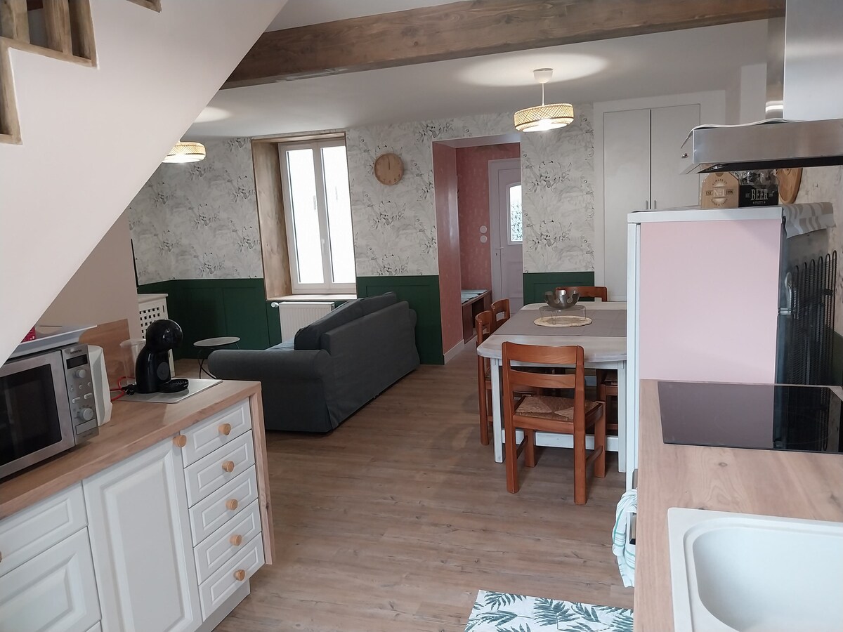 petite maison dans une impasse au calme le logement est refait à neuf, il comporte une cuisine au rez de chaussée avec tout l'équipement de base avec eau chaude, chauffage puis un escalier donne sur une petite chambre à l'étage, la literie est neuve, la chambre dispose d'une douche, d'un lave main et d'un WC séparé par un rideau ce logement cosy est organisé en fonction de la place disponible et convient à une personne seule ou à un couple (wifi, chauffage, arrivée autonome...)