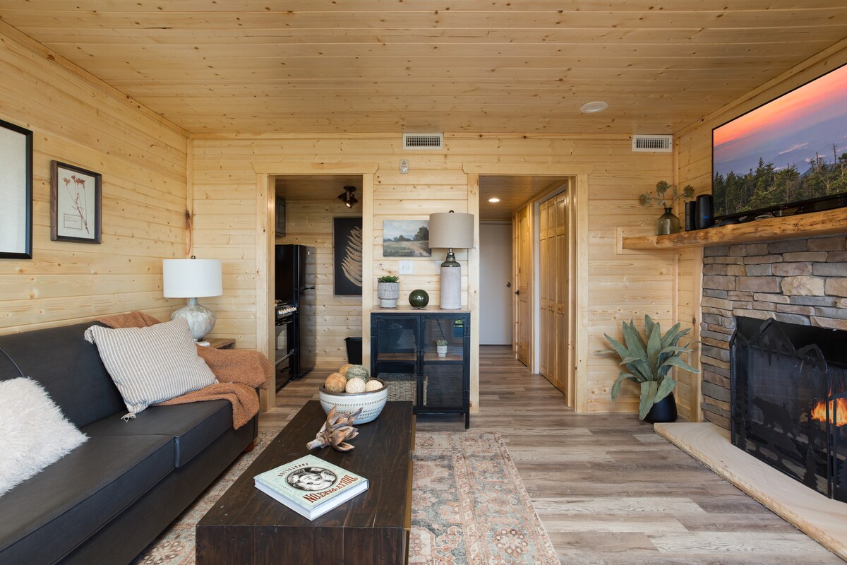 Cabin mini hiện đại với bồn tắm nước nóng, lò sưởi và Wifi