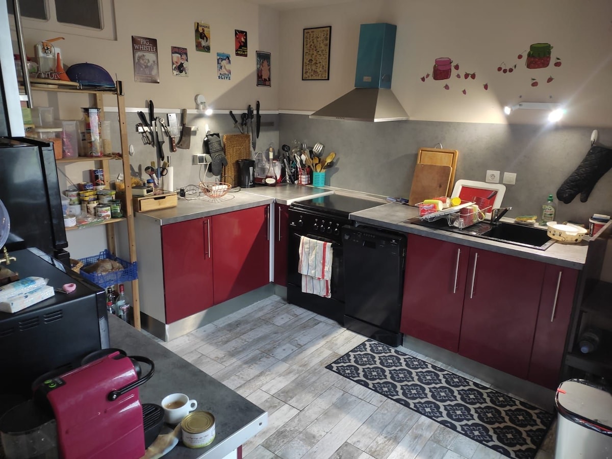 Tôi chào đón bạn ở tầng trệt của ngôi nhà tôi nằm ngay trung tâm khu phố lịch sử Aubusson. Đây là chỗ ở không hút thuốc rộng 30 m2, có nhà bếp và phòng khách. Bếp được trang bị đầy đủ tiện nghi nhìn ra một sân nhỏ riêng. Phòng khách cho 3 người, với một giường đôi 140 và một giường đơn, wifi và TV. Phòng tắm ở tầng trệt là riêng tư tại chỗ ở nhưng nằm bên ngoài phòng khách, chỉ có nhà vệ sinh ở lối vào nhà là chung.