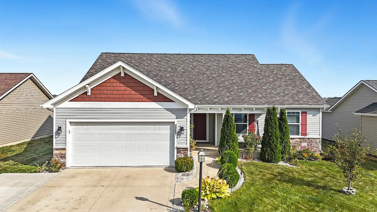 Welcome to your peaceful Fort Wayne retreat! This beautiful 8-year-old ranch offers 3 bedrooms, 3 full baths, and over 2,500 sq. ft. of inviting living space, including a spacious finished basement. Sip morning coffee while overlooking the tranquil pond or relax on the covered porch. Inside, the open floor plan, cathedral ceilings, and modern kitchen with island create the perfect blend of warmth, comfort, and togetherness.