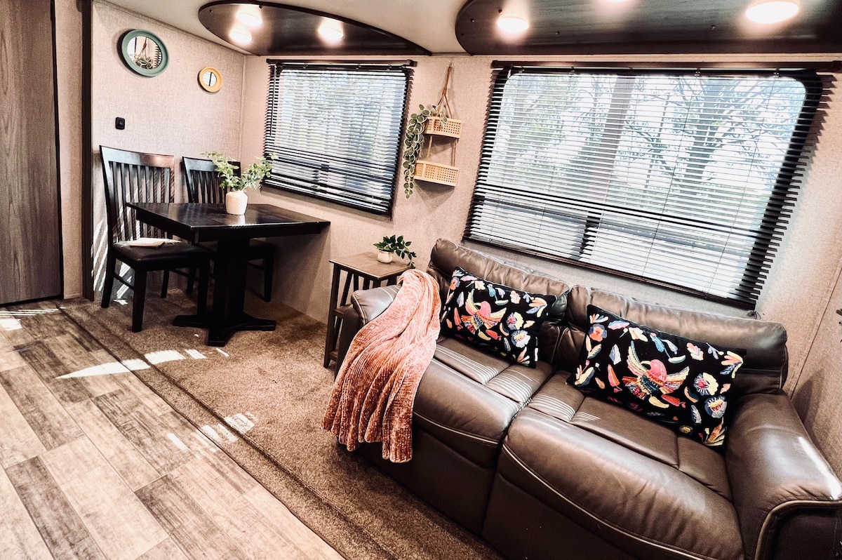 Charming 2-Bedroom Boho RV in the Heart of Flower Mound – Wild Peacocks Included! This cozy 2-bedroom RV offers the perfect blend of comfort, style, and nature. Experience the tranquility of a private, boho-inspired retreat with the added bonus of being surrounded by the beauty of nature, watch wild peacocks roam right outside your door! The RV is thoughtfully decorated in a warm, inviting boho style, creating the perfect atmosphere for relaxation. Perfect for couples or small families.