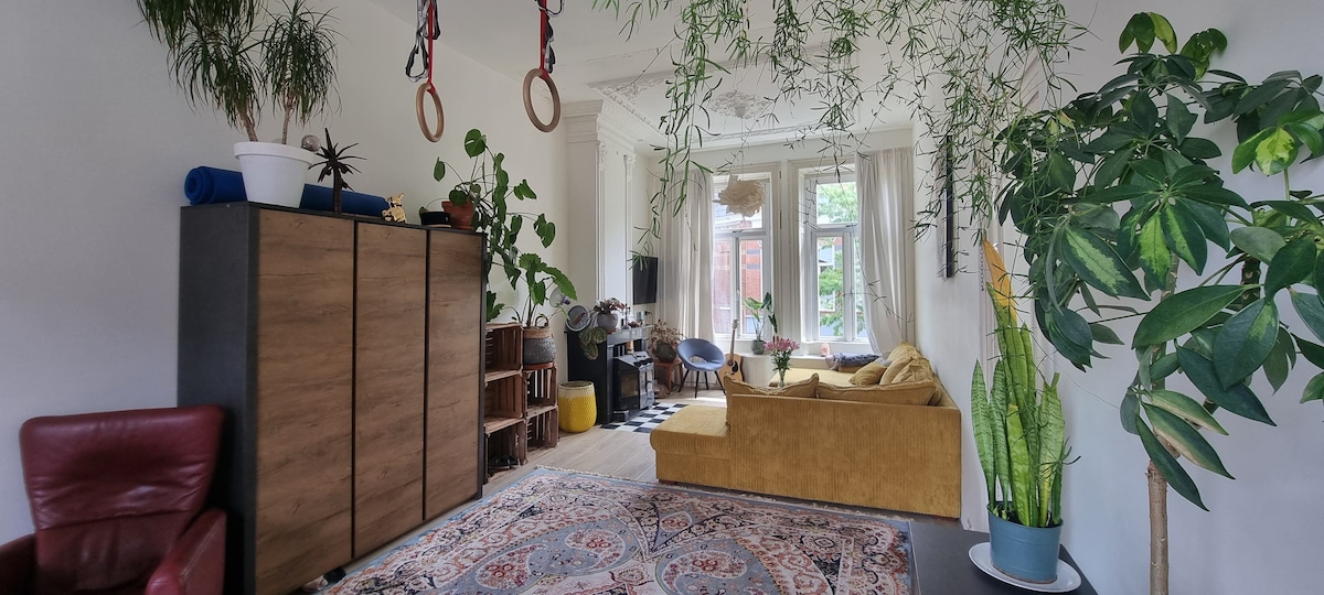 Come and spend the night in my spacious ground floor apartment dating from 1906 with French doors facing the garden! The apartment has its own toilet/shower and a small kitchen. You have a choice of beds, a comfortable queen size bed, single bed, loft bed and a sofa bed. The city center is close by, just like the museum and central train station. Don't hesitate to ask if you require a child's bed, or if you want to bring your dog; nearly everything is possible!