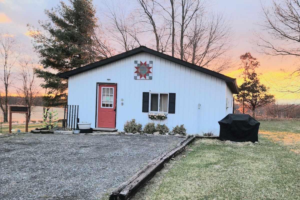 Barn Quilt Bungalow - Quang cảnh ngựa ngay ngoài cửa sổ của bạn! Bao gồm 1 phòng ngủ (queen), 1 nệm kéo ra (queen), 1 phòng tắm (chỉ vòi sen), phòng khách, nhà bếp, sưởi ấm & điều hòa nhiệt độ. Đi bộ trên những con đường mòn hoặc đi bộ đến nhà máy rượu. CÔNG SUẤT TỐI ĐA là HAI khách. Bạn có thể thêm một phần ba với giá 30 USD/đêm. Khách không được mang thêm người, dù là bao lâu. Airbnb sẽ được liên hệ ngay nếu bạn vượt quá sức chứa tối đa. Không có trẻ em, động vật hoặc động vật phục vụ (dị ứng/nguy cơ sức khỏe).