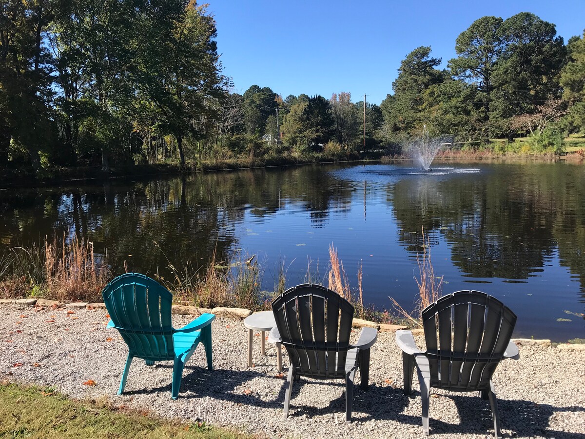 Tại trung tâm Wake Forest. Thư giãn bên lò sưởi với tre mang đến sự riêng tư để cảm nhận cách xa hàng dặm. Thư giãn với đồ uống trong bồn tắm nước nóng trong khi thức ăn của bạn ở trên vỉ nướng. Sau đó thư giãn sau khi thư giãn trong bồn tắm Jacuzzi lớn trong bồn tắm chính. Lò sưởi đốt củi và bảng phi tiêu trong phòng khách tạo nên một đêm vui vẻ ở nhà. Phòng lớn và giường & gối rất thoải mái và màn hình phẳng & Roku trong mỗi phòng!