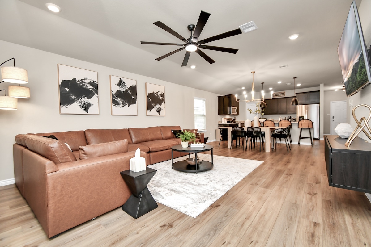 Relax in a brand new "Mid Century Modern" townhome located in the Historical Downtown Bryan & in walking distance to Ronin, Black Water Draw, RX Pizza, the Village, Cilantro & many more Restaurants. Master bedroom has a king sized bed & each room has 58 plus Smart TV.. Log into your personal streaming account or use our Hulu, Disney or ESPN, as a courtesy. Relax in private backyard with a beautiful view or cook in the beautiful kitchen which includes a Keurig coffee maker with pods & creamers.