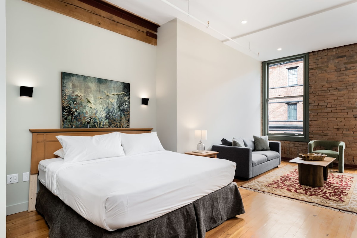 Căn hộ tầng lửng hai tầng mang tính di sản tại Block House, khách sạn căn hộ boutique của Gastown. Có hai giường cỡ King – một giường được đặt ở khu vực lửng trên – cùng với nhà bếp đầy đủ tiện nghi với máy rửa chén, tủ lạnh, bếp nấu và lò vi sóng, khu vực ăn uống và sinh hoạt, tường gạch lộ thiên nguyên bản và nội thất hiện đại giữa thế kỷ ở khắp mọi nơi. Phòng tắm riêng có vòi sen đứng, ga trải giường mềm mại, áo choàng tắm và các tiện nghi phòng tắm của Tallu. Đã bao gồm dịch vụ giặt ủi trong phòng.