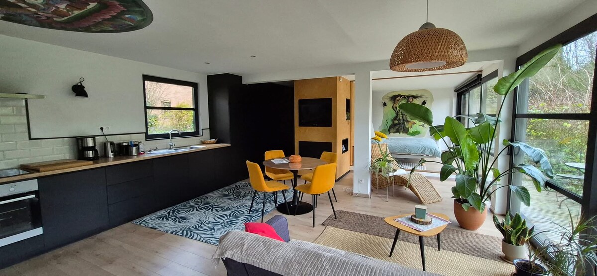 Hãy đến và tận hưởng spa riêng tư trong một đêm hoặc một dịp cuối tuần! Bạn sẽ bị quyến rũ bởi chỗ ở duyên dáng này với diện tích hơn 40 m2, hoàn toàn mới. Chỗ ở bao gồm khu vực sinh hoạt với bồn tắm nước xoáy và phòng xông hơi khô, bếp đầy đủ tiện nghi, phòng ngủ có giường cỡ Queen và TV màn hình phẳng (Netflix, Prime Video), phòng tắm có buồng tắm đứng và nhà vệ sinh riêng. Một khu vực ngoài trời đẹp với sân hiên đang chờ bạn.