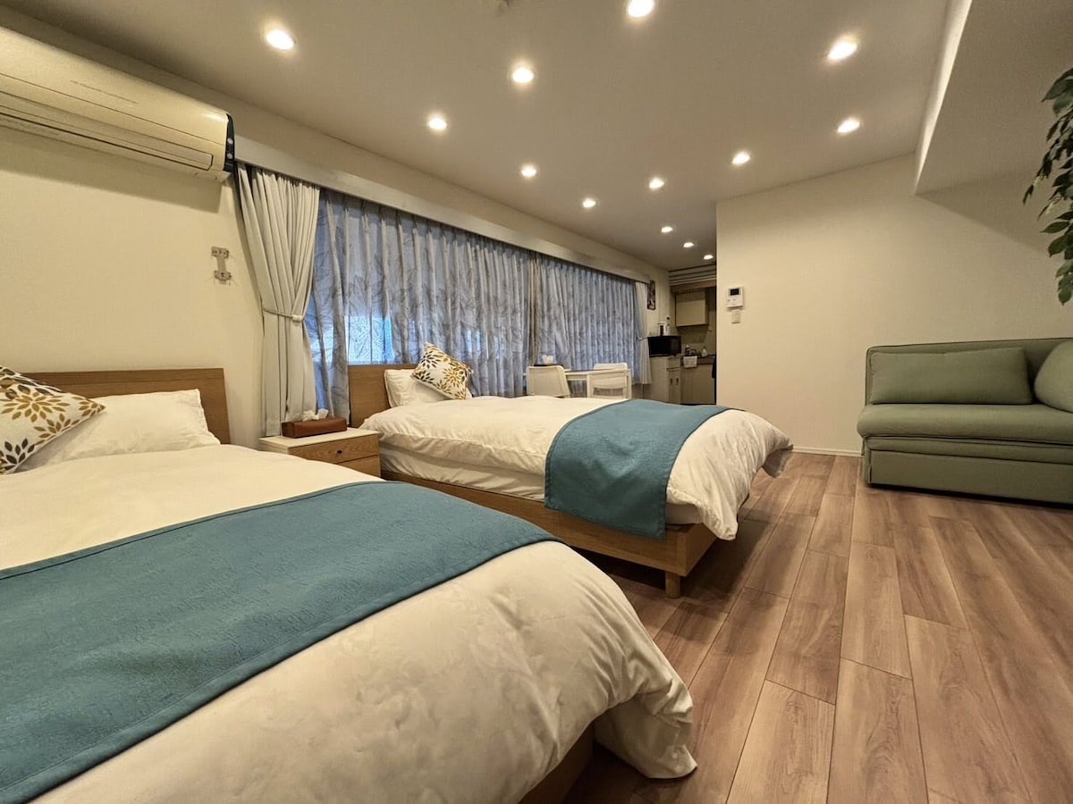 最大6名が同時に宿泊可能で、キッチンや洗濯機があるコンドミニアムスタイルの宿です。 友達同士のご旅行、複数家族でのご旅行、結婚式や同窓会の機会に、みなさんでどうぞお泊りください。 キッキンや洗濯機も付いているので、長期滞在にもおすすめです。 ※重要 ◯お布団について 4名さままでは和室に敷き布団形式、5名様以上の場合は、和室に敷き布団4セット+ソファベッドの仕様となります。シーツはセルフセッティングをお願いしております。 ◯未就学児、添い寝の場合の料金について 【添い寝に関して】 未就学児の場合 無料 小学生以上の場合 4,000円/人 別途請求させていただきます。 【お布団が必要な場合】 ご年齢に関わらず、通常の一名様追加分の料金を別途請求させていただきます