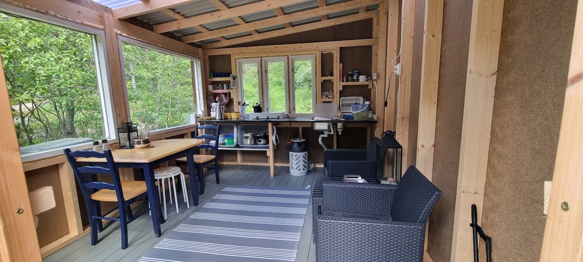 Cabin rộng 80 m2 và có phòng khách/nhà bếp, phòng ngủ, phòng tắm, gian hàng gỗ và gác xép lớn (30 m2). Ngoài ra còn có một phụ lục 5 m2. Nó nằm thoáng mát và cao với tầm nhìn hướng ra mặt nước, Gjevden. Có khoảng 30 m2 hiên nhà cộng với lớn ở bên ngoài. Vì không có điện trong sân cabin, cabin được trang bị các tấm pin mặt trời. Vì vậy, được gọi là Off-Grid. Đừng lãng phí điện và nước nếu không thì có lò sưởi. trong nhà bếp có mọi thứ cần thiết để nấu ăn và bếp ga. Nhà VỆ sinh trong nhà. Nhà VỆ sinh phải được SỬ dụng chỗ ngồi.