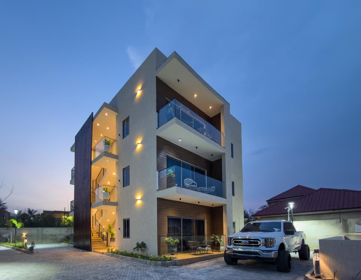 Chào mừng bạn đến với kỳ nghỉ đô thị cao cấp tại thành phố Accra! Với tầm nhìn tuyệt đẹp ra dãy núi Aburi, chỉ cách đó vài phút lái xe hoặc 15 phút đi bộ. Cách sân bay dưới 12 dặm, đi thẳng trên đường M4 mà không rẽ. Căn hộ hai phòng ngủ của chúng tôi mang đến niềm vui và sự thoải mái với an ninh 24/7, điện và nước 24/7, với các tiện nghi độc quyền, chẳng hạn như hồ bơi, sân thượng, phòng tập thể dục hiện đại, nhà bếp đầy đủ, wifi, tiệc nướng và hơn thế nữa sẽ làm cho thời gian lưu trú của bạn thực sự khó quên