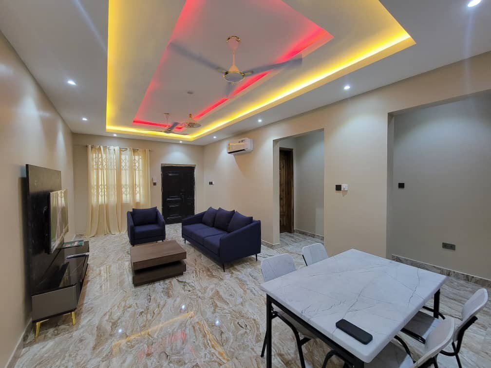 Located at “Rash Comfy Apartments” on google maps. * Unbeatable location (Easy access to Achimota Mall and airport) * In-house pharmacist available for first aid. * Suited for Individual or group trips. * Spacious bedrooms ensuite, fitted with Super King-sized beds. * Work from home using high speed 24/7 WIFI. * Refrigerator, Fully furnished kitchen for long stay guests. * Cleaning services included.
