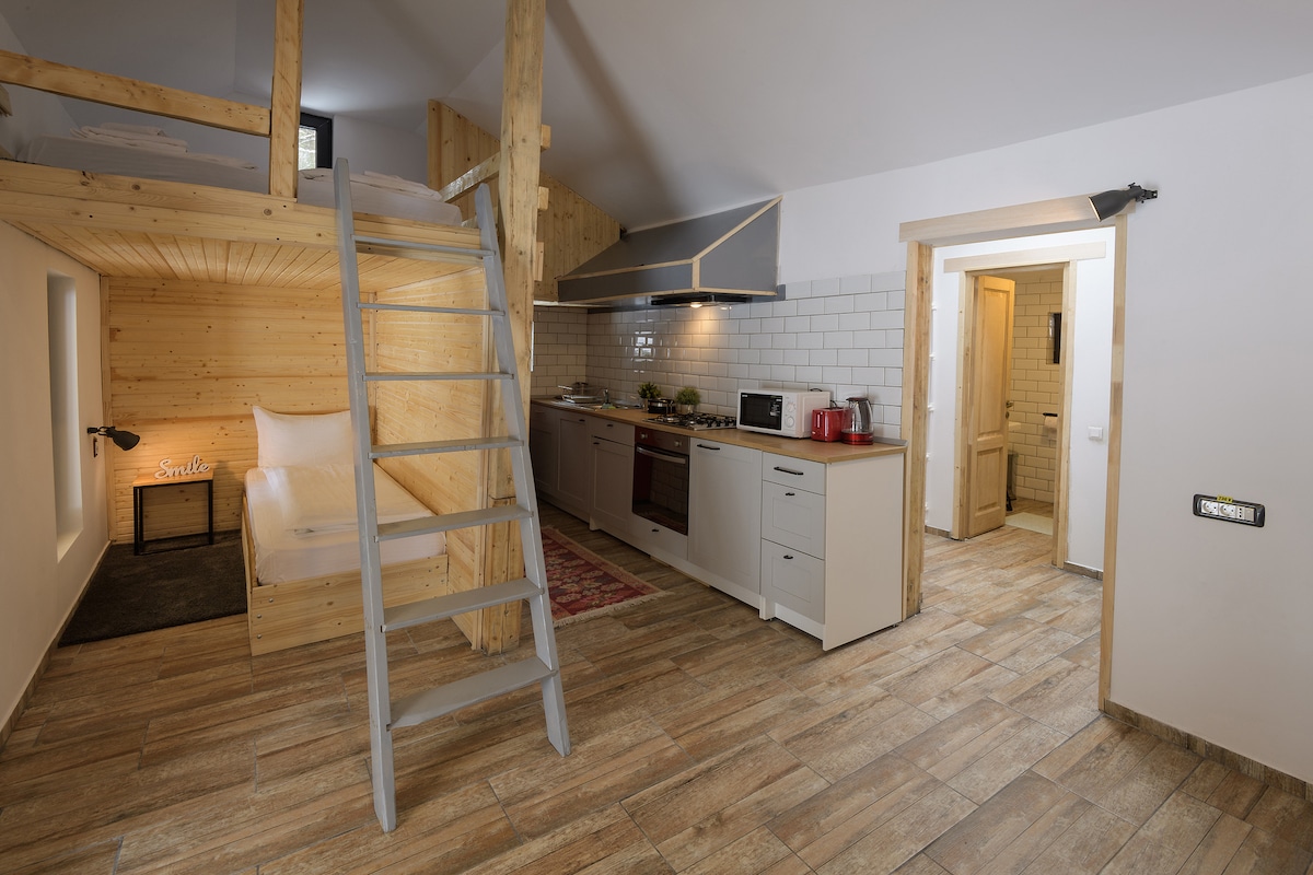 Chỗ ở là loại studio, mới được cải tạo với diện tích 25 m2. Nó lý tưởng cho một gia đình có con tối đa 8 tuổi, có phòng ngủ với giường cỡ 140/200 và ghế bành có thể kéo dài (75/166 cm). Nhà bếp và phòng tắm riêng. Studio sở hữu một phòng khách chung với một căn hộ và phòng xông hơi khô khác (tính phí).