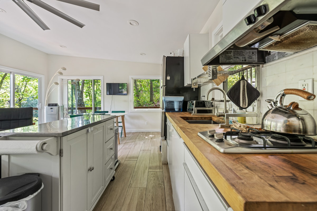 Bạn có yêu thiên nhiên, động vật và tiện nghi spa không? Vậy thì đây là địa điểm hoàn hảo cho bạn! Đây là một khu vực hoàn chỉnh, riêng tư ở tầng trệt, ở tầng hầm của ngôi nhà chính. Ngay bên ngoài cửa trước của bạn là 800 mẫu đường mòn đi bộ đường dài. Xung quanh bạn là một khu rừng trưởng thành, với những con dê, ngỗng, vịt, mèo và chó con đáng yêu và hòa đồng. Để nâng cao trải nghiệm nghỉ dưỡng riêng này, có bồn tắm nước nóng và phòng xông hơi cách cửa nhà bạn vài bước chân. Vừa thêm điều hòa không khí chia nhỏ!