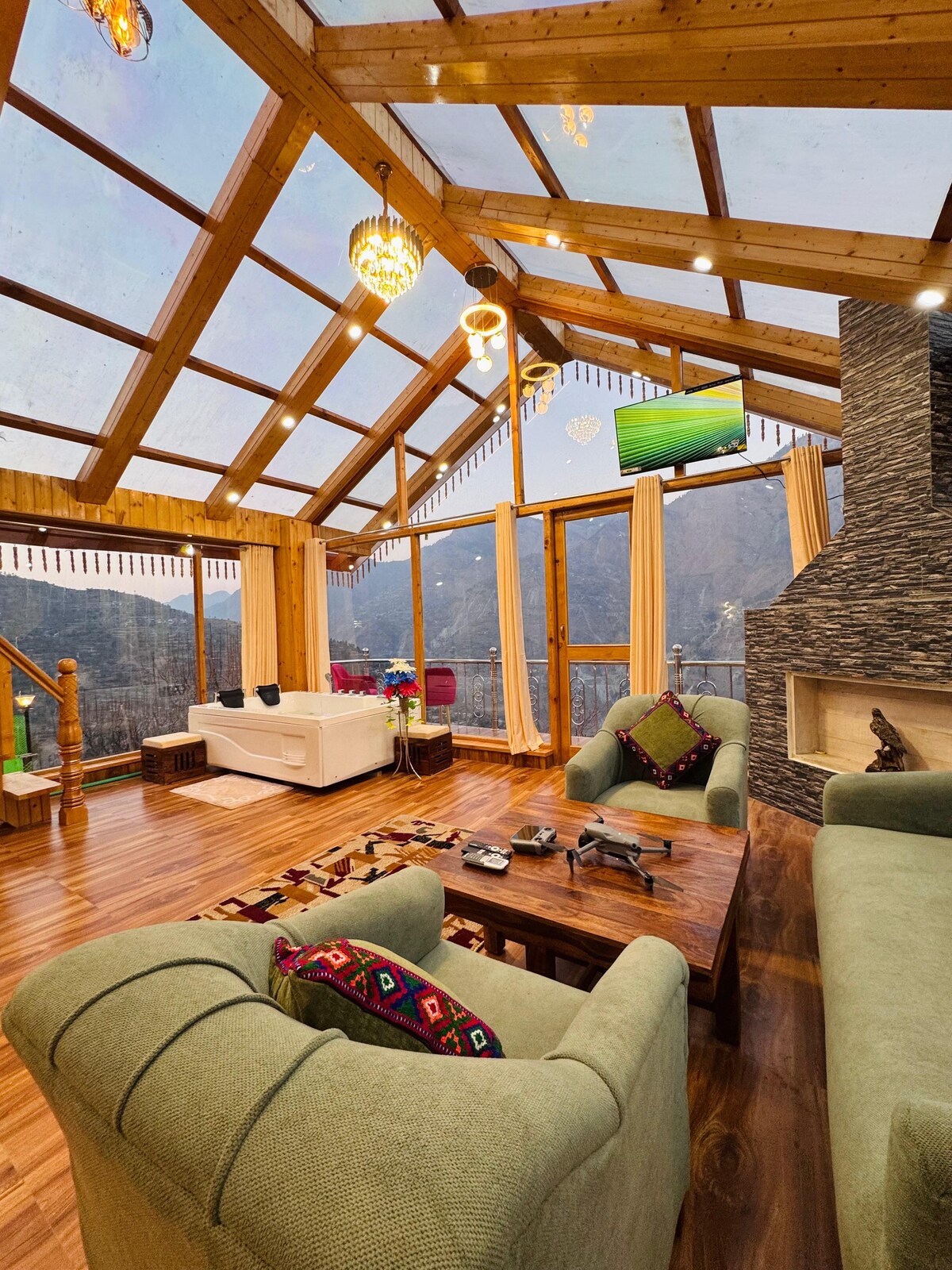 Trải nghiệm sự pha trộn hoàn hảo giữa thiên nhiên và sự sang trọng, nằm trên đỉnh đồi Tandi gần Jibhi. Tận hưởng cảm giác ngâm mình trong bồn tắm bong bóng nước nóng trong khi tận hưởng khung cảnh ngoạn mục ngay từ bồn tắm của bạn. Ẩn mình khỏi đường và tiếng ồn giao thông, âm thanh duy nhất bạn sẽ gặp phải là tiếng chim hót du dương. Với một cabin hoàn toàn bằng kính, bạn thậm chí có thể phát hiện ra một con sóc bay hoặc thoáng thấy một ngôi sao băng trên bầu trời đêm thanh bình. Thư giãn và tận hưởng sự yên tĩnh của kỳ nghỉ sang trọng, yên bình này.
