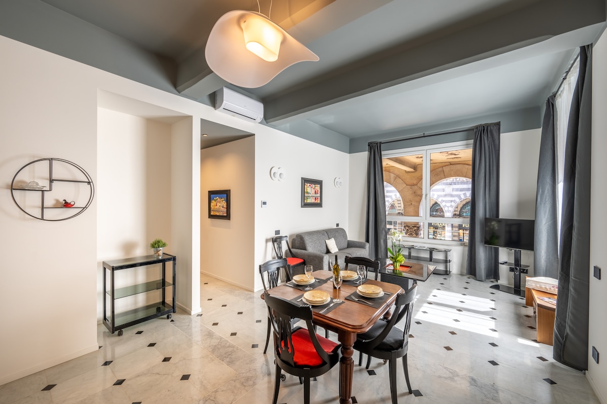 Monolocale situato in "Arco" seicentesco appena ristrutturato, a due passi dalla centralissima Via XX settembre. La struttura si compone di 6 appartamenti e di n.3 posti auto al suo interno (20€/gg previa disponibilità). Arredato in stile industriale , misura 47 mq ed è composto da ingresso con ampio armadio, bagno, divano letto, angolo cottura. The e caffè forniti. I doppi vetri e le tende oscuranti garantiscono un buon riposo, wi-fi, smart tv, lavatrice ed asciugatrice in comune.