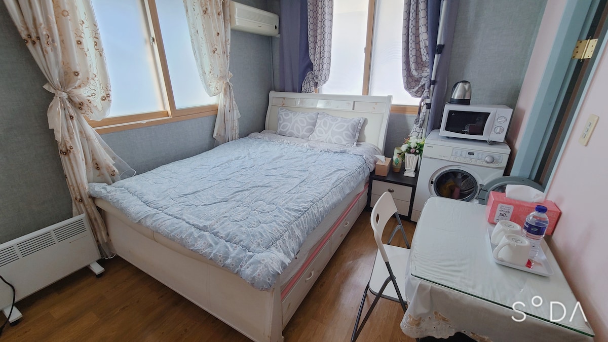 ◈방◈ 퀸 사이즈 침대 붙박이장 화장대 테이블 TV 에어컨 드라이기 ◈욕실◈ 샴푸&린스&바디워시&폼클렌져 손세정&일회용 칫솔&면도기 치약 수건 ◈주방◈ 냉장고, 가스레인지, 전자레인지,커피포트 그릇&머그컵, 소주잔, 각종 기본 양념 냄비&프라이팬&조리도구 ◈기타◈ 세탁기(세탁세제) 청소도구 Free wifi 도보 1분거리 편의점 도보 2분거리 다양한 맛집 대전역 차량 3분거리 중앙로역 도보 5분거리 은행동 번화가 도보 5분거리 지하상가 도보 2분거리