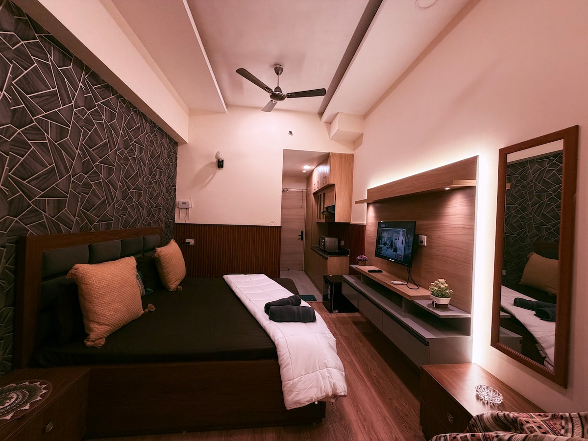 Chào mừng bạn đến với căn hộ studio có máy lạnh, được thiết kế tỉ mỉ, mang đến sự thoải mái, phong cách và riêng tư trong một khu dân cư cao cấp ở Indirapuram. Với phong cách trang trí thanh lịch, không gian ấm cúng, TV thông minh 55 inch với tất cả các OTT nổi bật như Netflix, Prime, Hotstar, v.v. đã đăng ký, cùng với bàn là, máy sấy tóc và bếp chức năng, không gian này lý tưởng cho các chuyến công tác, thời gian lưu trú ngắn hoặc các chuyến đi dài hơn. Yên tĩnh, an toàn và kết nối tốt, studio này hứa hẹn một kỳ ở thoải mái mà bạn sẽ vui vẻ quay trở lại.